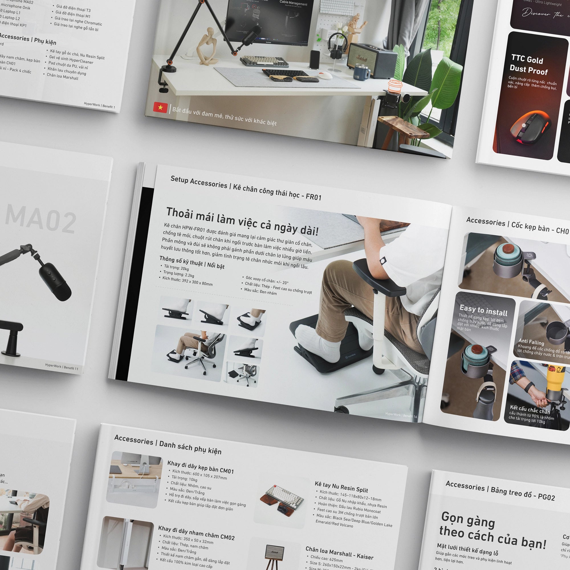 HyperWork hiện có 4 dải phẩm chính bao gồm: Giá đỡ, nội thất, thiết bị ngoại vi, phụ kiện setup