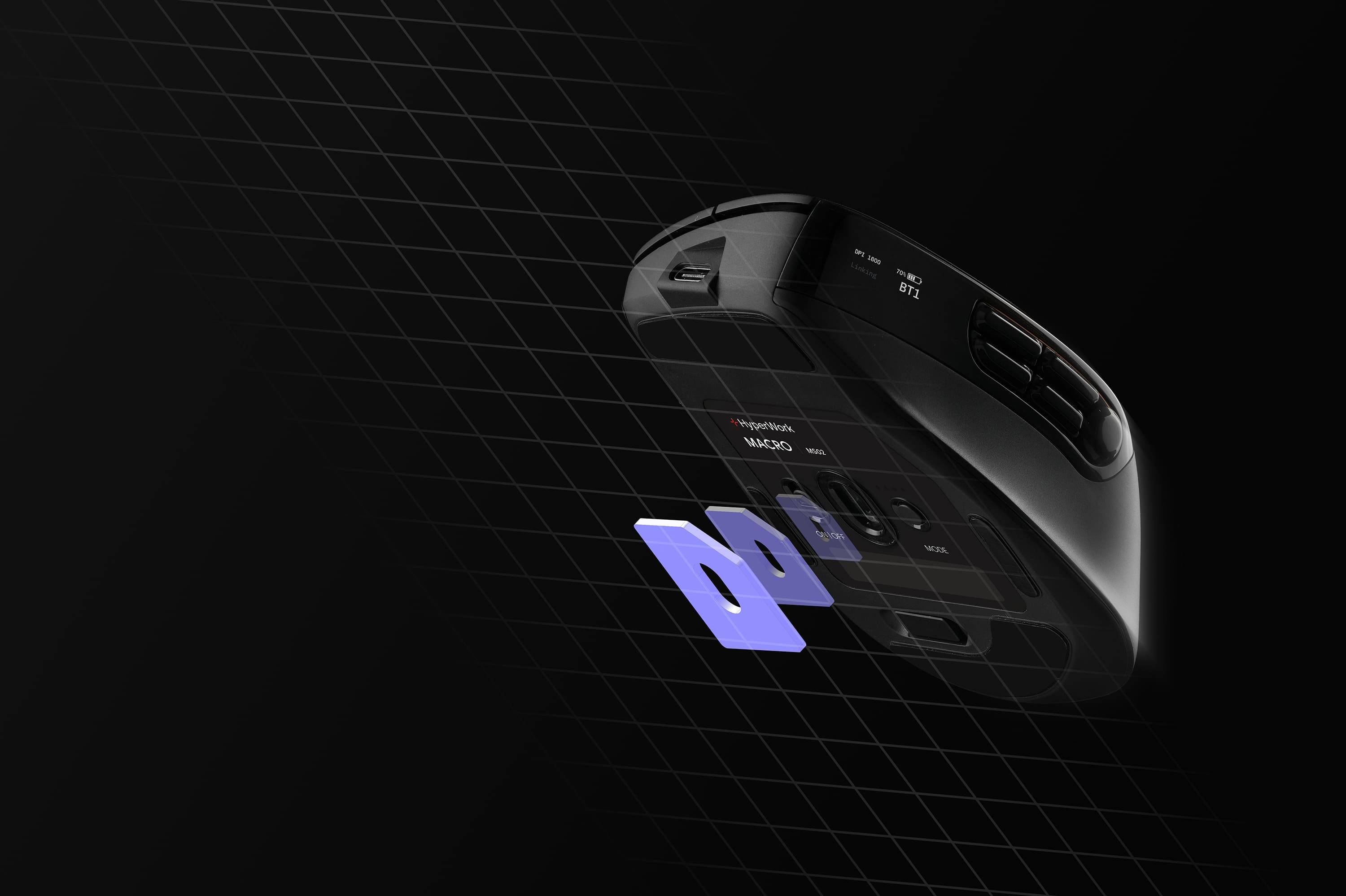 Bên thân Macro, màn hình điện tử được tích hợp cung cấp thông tin về phần trăm pin, tình trạng, chế độ kết nối và DPI.