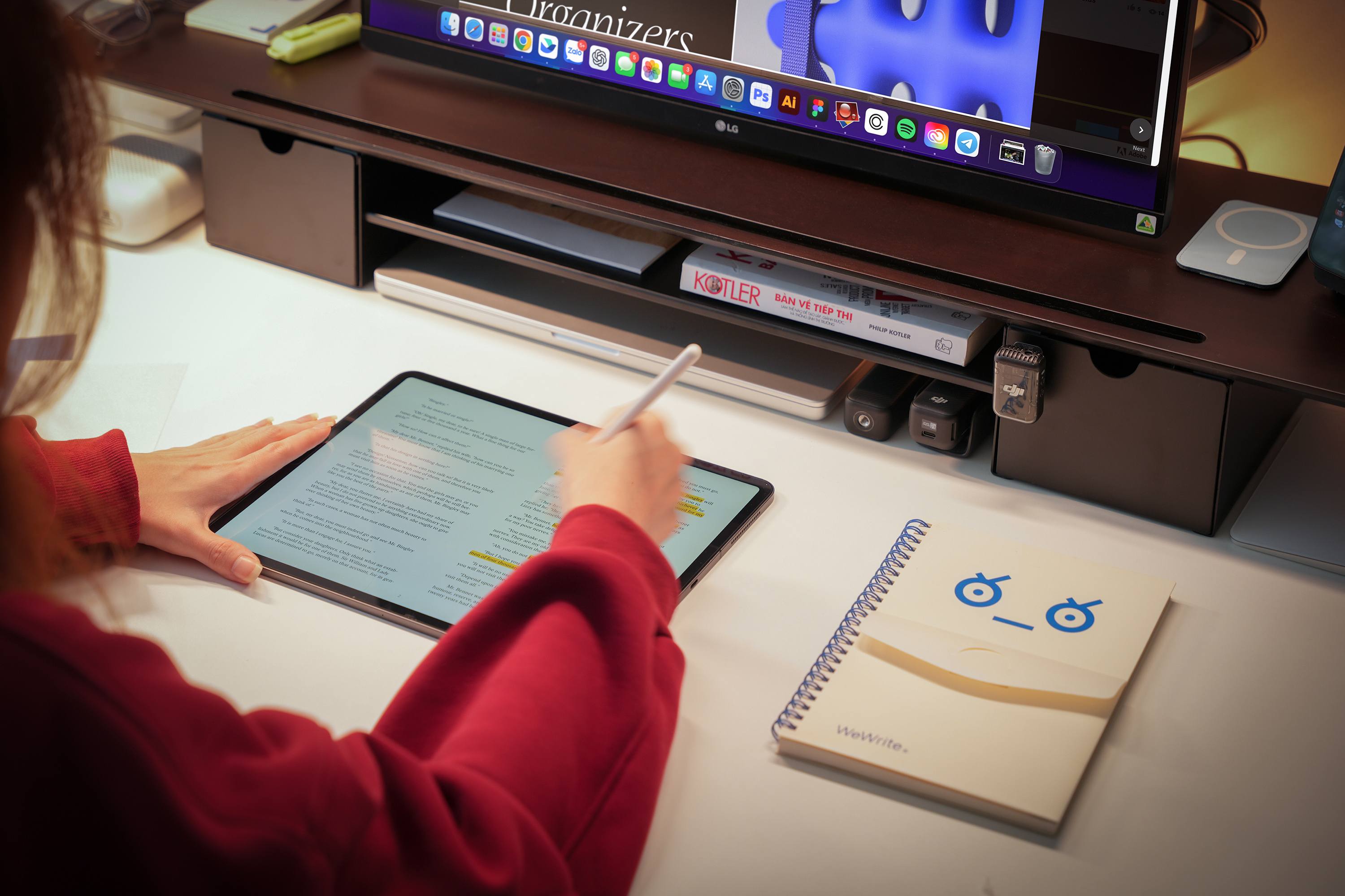 Kệ 2 tầng HyperWork DS02 tối ưu khu vực dưới màn hình, cất gọn phím chuột, sổ tay, tablet, dock hub,... nới rộng không gian để đồ mà vẫn gọn gàng, khoa học.