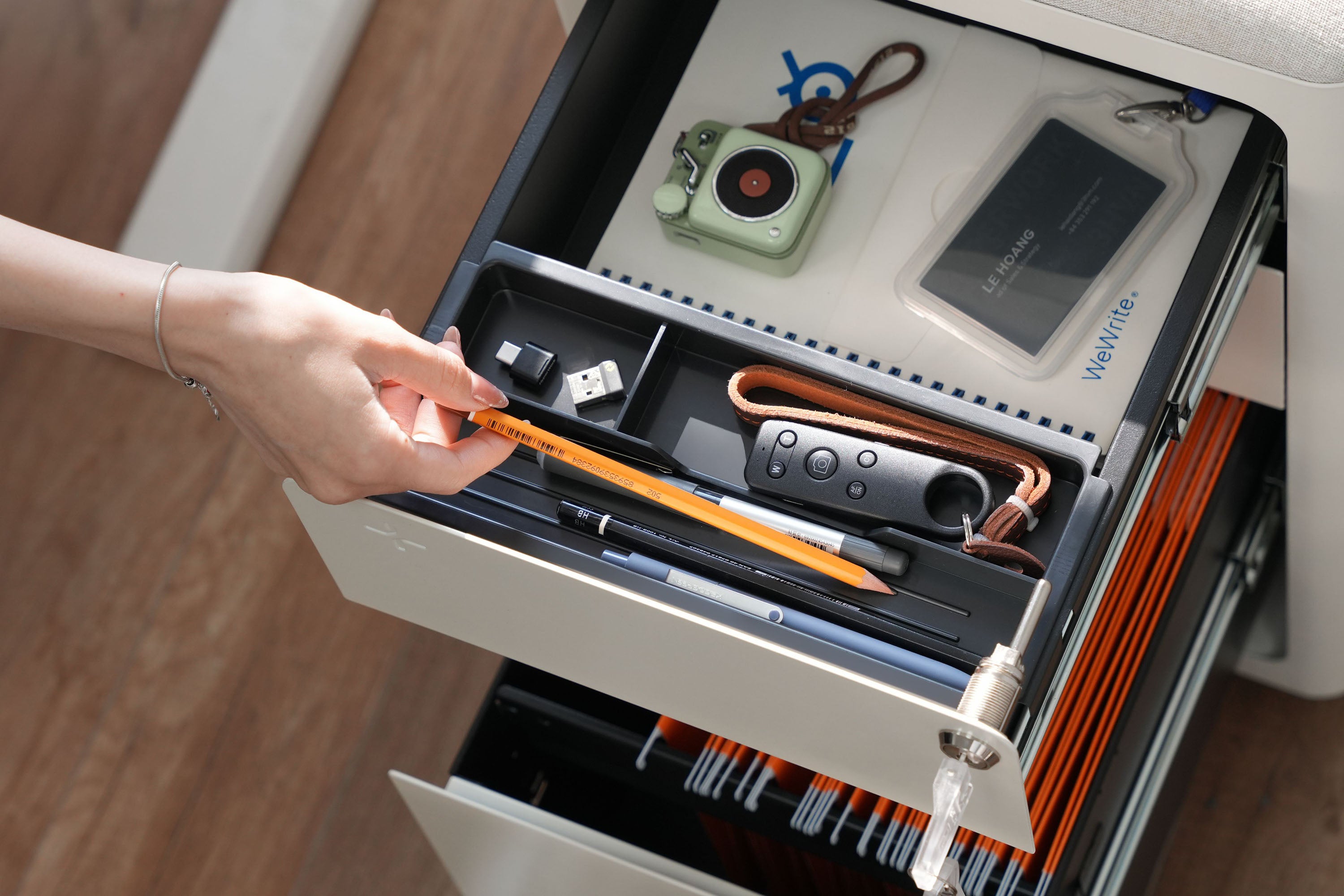 Các ngăn kéo tối ưu cho tài liệu size A4 / Letter / Legal, phù hợp với các loại giấy tờ, hợp đồng, hồ sơ. Ngăn nhỏ đầu tiên bổ sung khay đựng bút thước, kéo, sổ, riêng ngăn kéo lớn còn bố trí trình ký tài liệu thuận tiện cho lưu trữ.