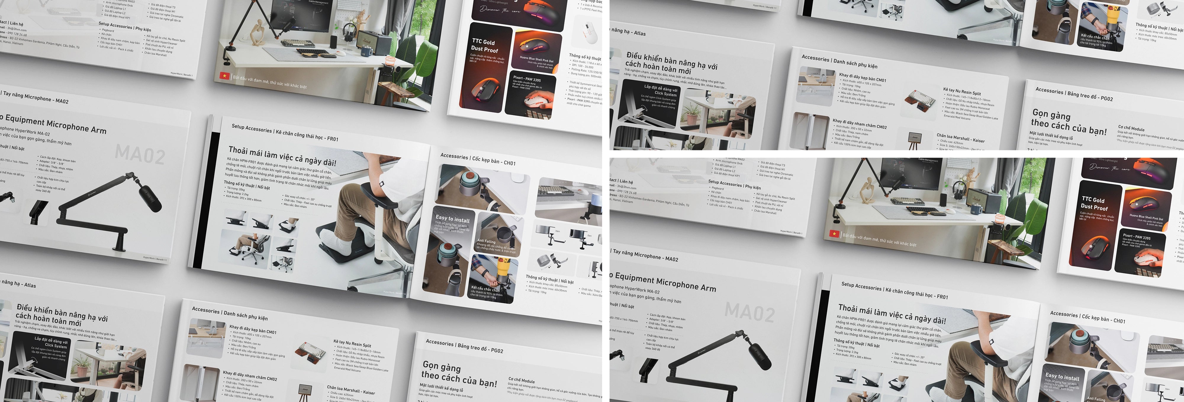 HyperWork hiện có 4 dải phẩm chính bao gồm: Giá đỡ, nội thất, thiết bị ngoại vi, phụ kiện setup