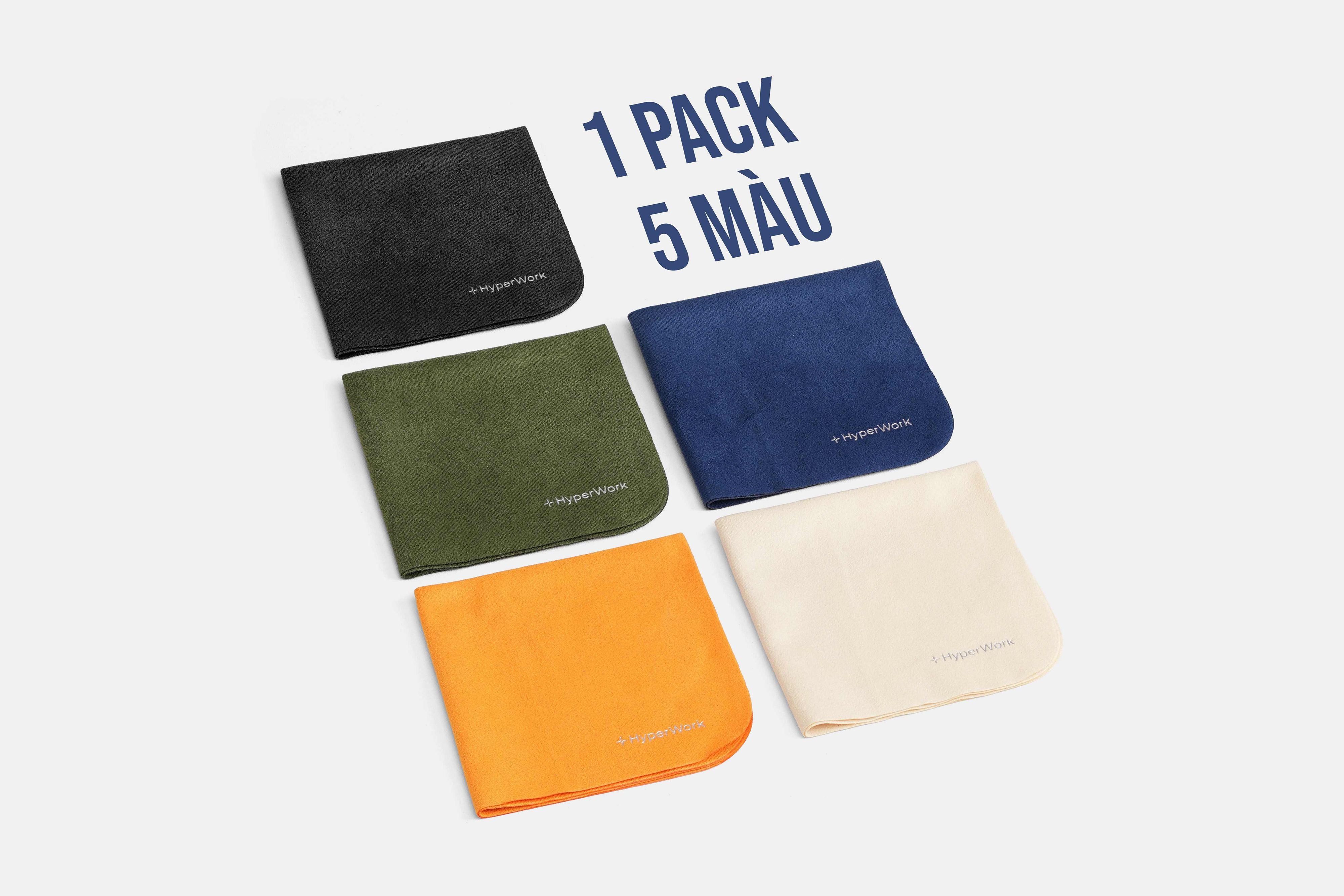 Bộ 5 khăn gồm Đen, Xanh Olive, Xanh Dương, Cam, Be — đồng bộ với tông màu hệ sinh thái HyperWork, phối hợp gọn gàng trên bàn làm việc.