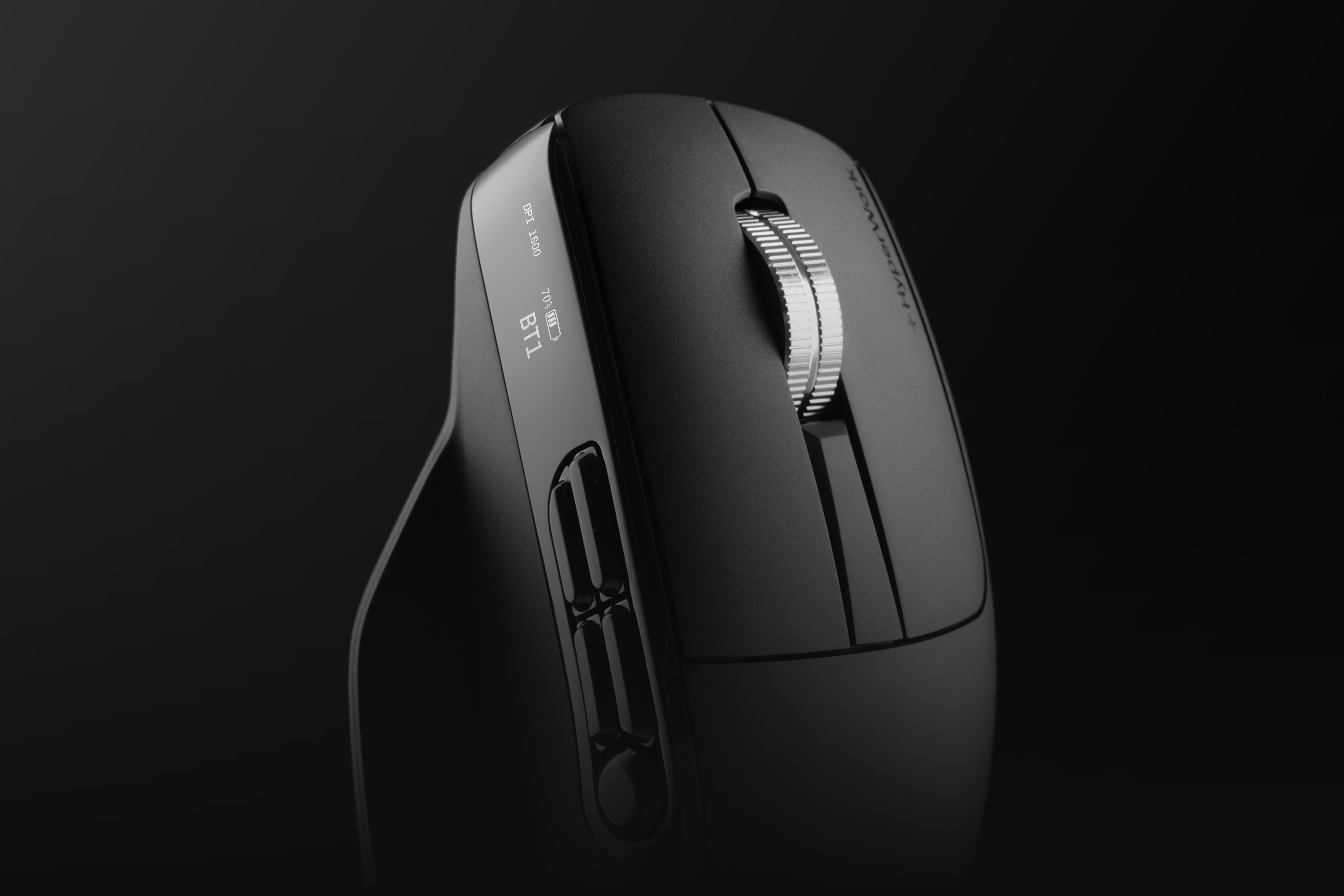 Bên thân Macro, màn hình điện tử được tích hợp cung cấp thông tin về phần trăm pin, tình trạng, chế độ kết nối và DPI.