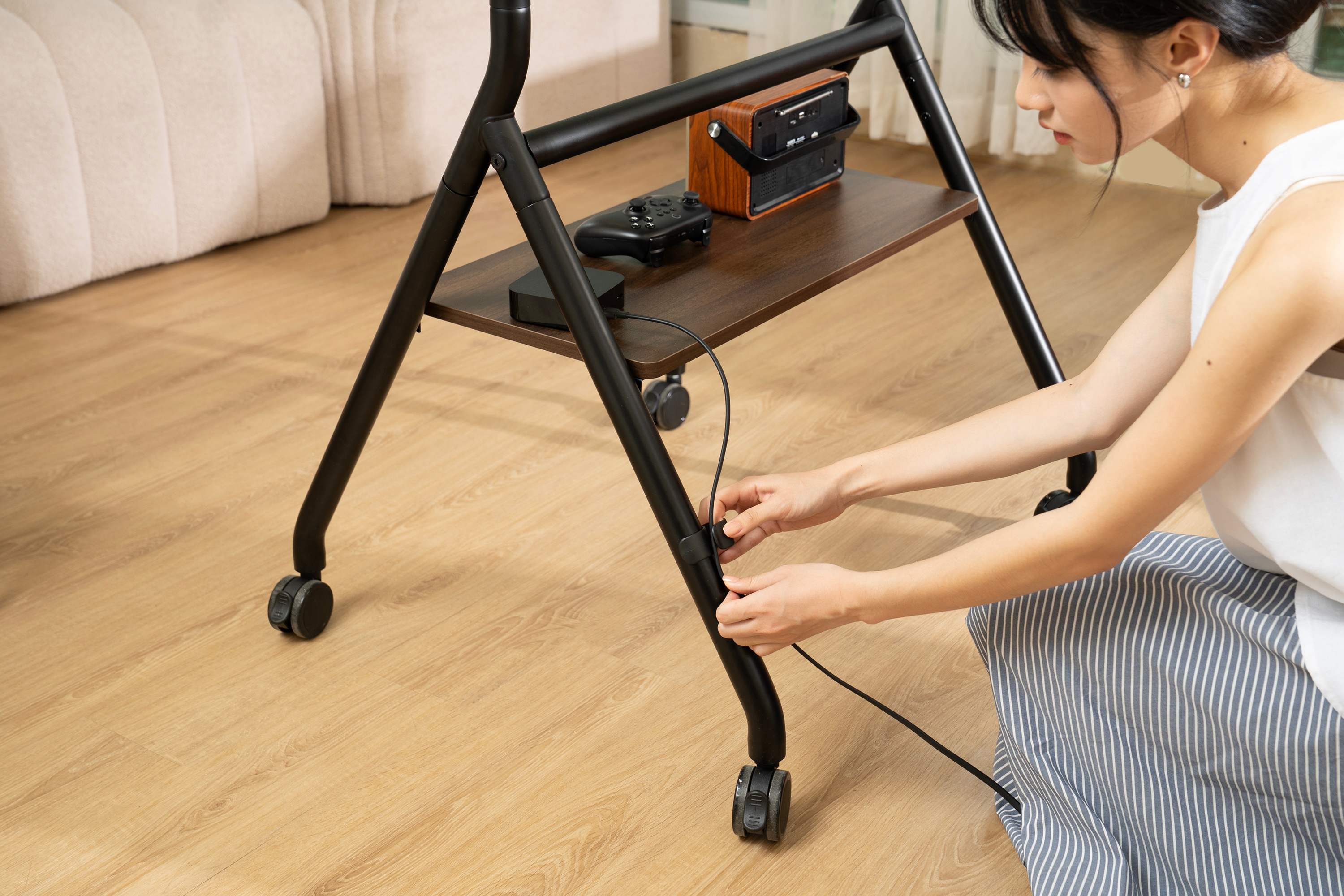 Hệ thống bánh xe 360° có khóa chắc chắn và khung thép bền bỉ tăng tính ổn định ngay cả khi di chuyển giá treo liên tục.