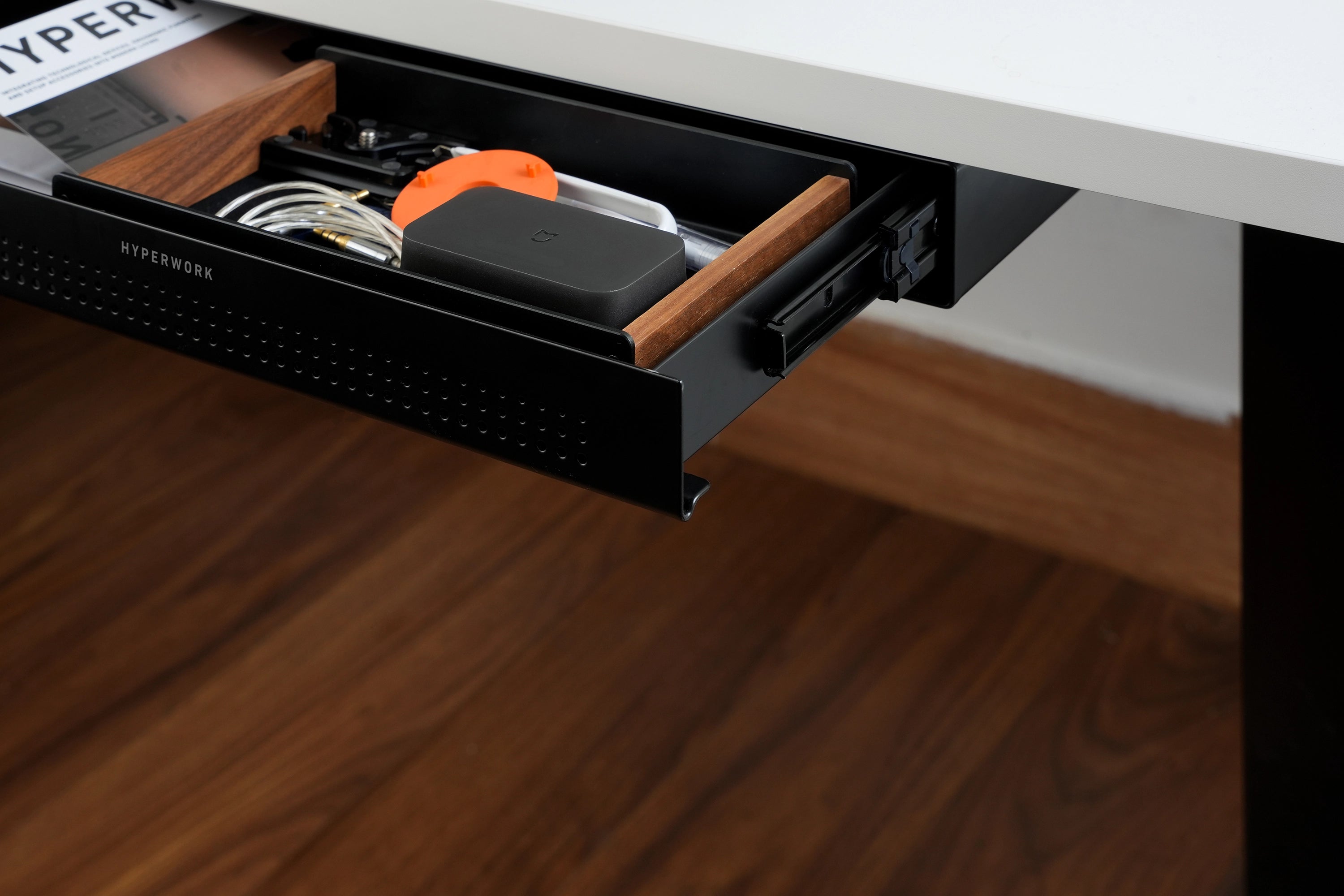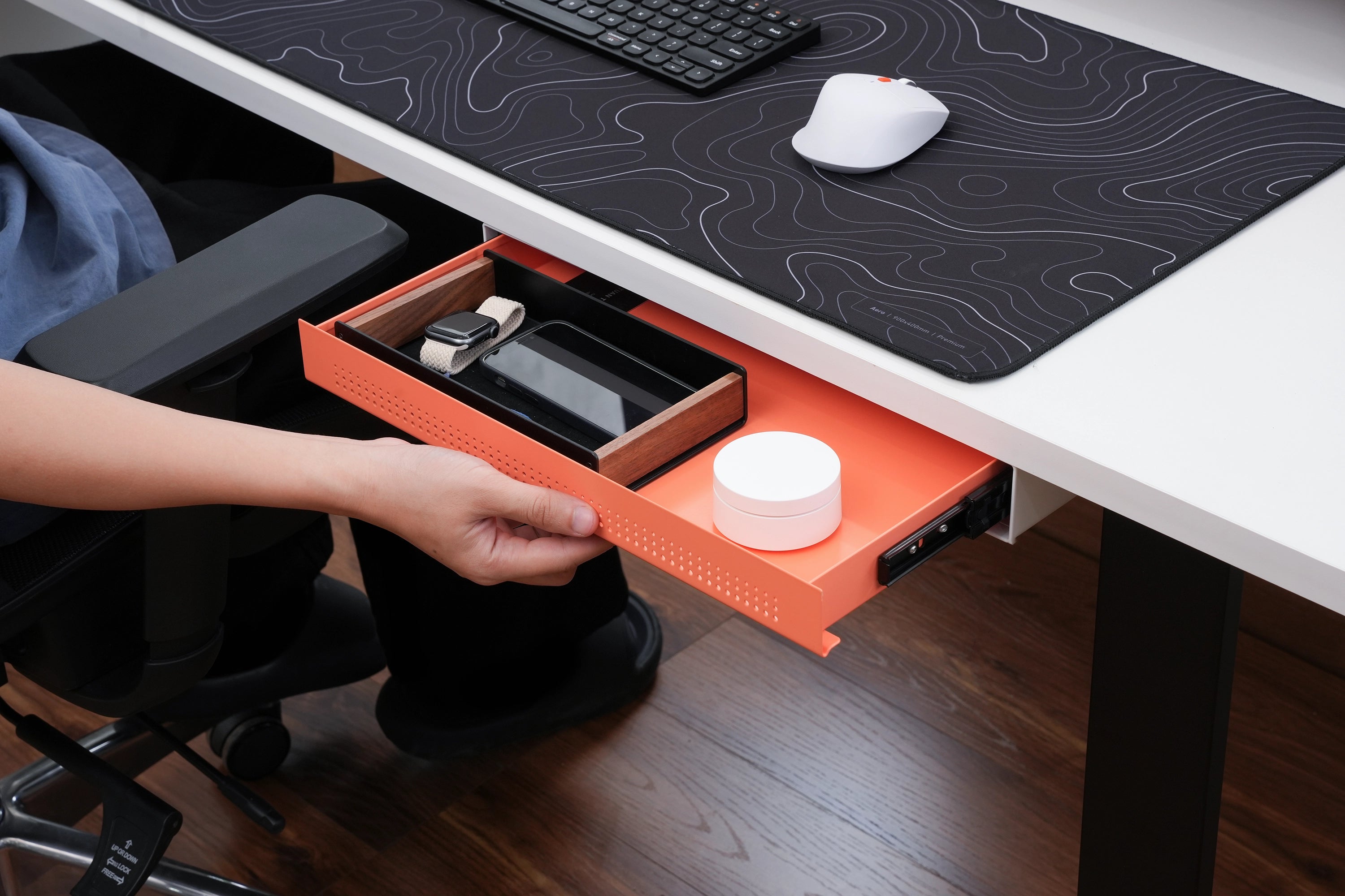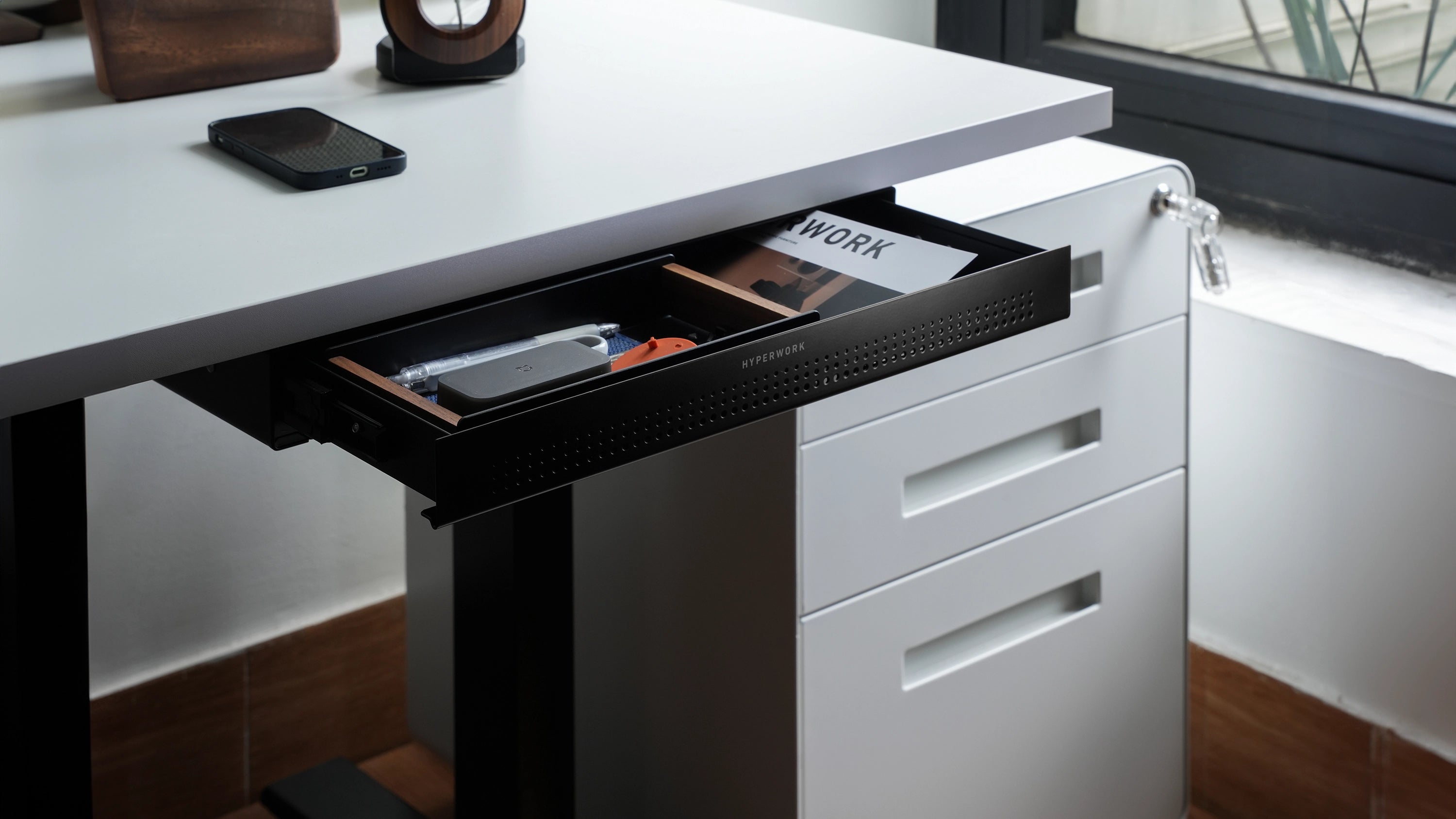 Không phải một giải pháp lưu trữ cồng kềnh phía dưới mặt bàn, gây vướng víu cho khu vực để chân, ngăn kéo DR01 với độ dày chưa tới 6 cm, đảm bảo vừa lưu trữ tài liệu, phụ kiện mà vẫn mỏng gọn, không chiếm diện tích.
